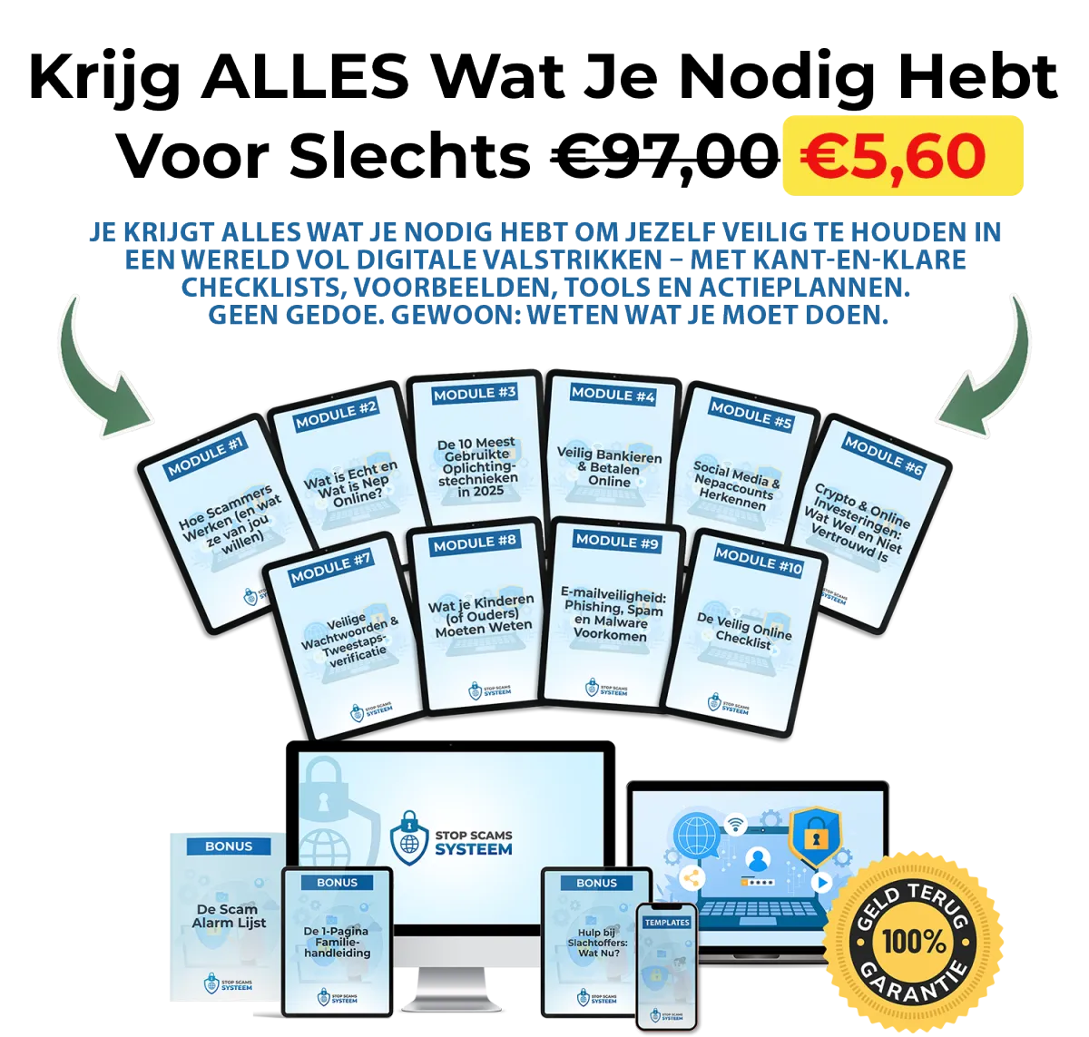 Als onderdeel van een reviewactie wordt het “Stop Scams Systeem” tijdelijk aangeboden voor slechts €5,60 in plaats van €97. Deze speciale deal is bedoeld om echte ervaringen en recensies te verzamelen – en is dus maar tijdelijk beschikbaar.